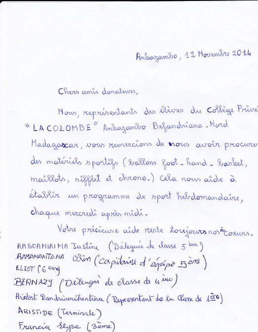 Du collège KALEBA, situé près de Tananarive, du collège Ankatafahely d'Ambanja et du collège La Colombe à Ankazambo.